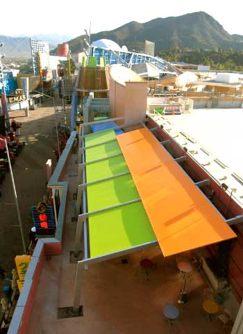 A new 2,200 s.f. steel frame and colored canvas shade structure for City Walk customers to the second level dining terrace. The structure sits on top of existing street retail between the club district and the new food court. The additional space provides seating and lounge area for both day and night time use. Completed