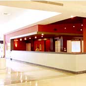 to the restaurant with low walls containing the interior courtyard. A