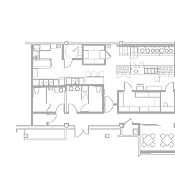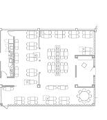 full kitchen, restrooms, and storage areas are to the rear of the space.